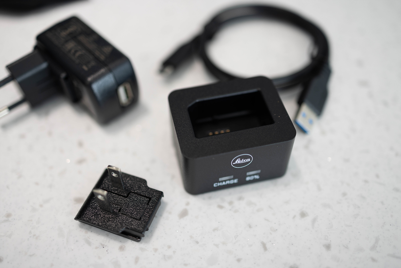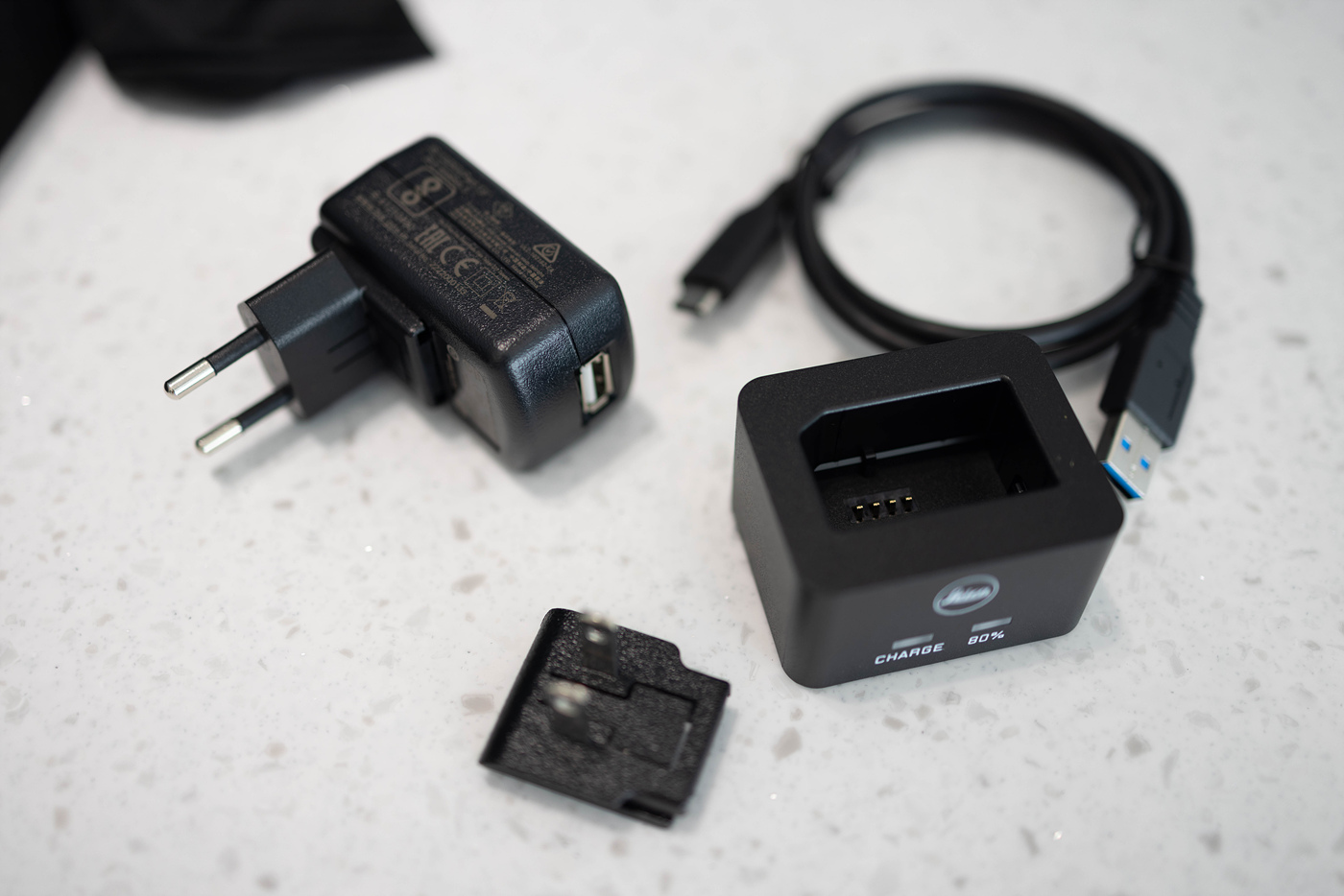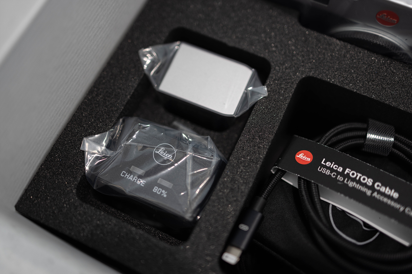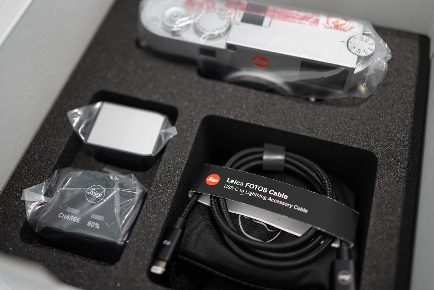 박스 한 면에 작게 MFI 로고가 표시되어 있다. 제 아무리 라이카라지만 디지털 바디이기도 하고, 호환성 측면에서 이러한 확장성은 칭찬할 만한 부분이다. 이번 제품에는 하단부에 USB-C 포트가 있어서 충전이 가능하고, 별도로 C to 8핀 케이블이 들어있어서 아이폰과 연결을 통해 사진을 빠르게 전송하거나, 전용 앱을 활용한 편의 기능들을 사용할 수 있다.